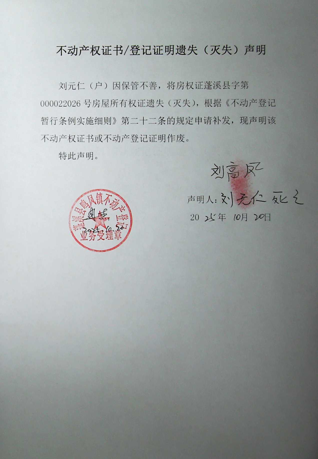 遗失补证公告(刘元仁)