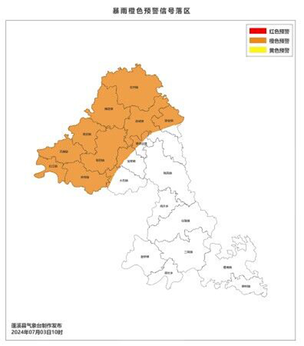 蓬溪县气象台2024年7月3日10时11分更新暴雨黄色预警信号为暴雨橙色预警信号,我县普安街道、槐花镇、吉祥镇、大石镇、宝梵镇、红江镇、天福镇、常乐镇、明月镇、文井镇、新会镇、赤城镇等乡镇(街道)3小时降雨量将达50毫米以上。根据《蓬溪县防汛抗旱应急预案》相关规定,我县于10时20分启动了防汛Ⅳ级(蓝色)应急响应。