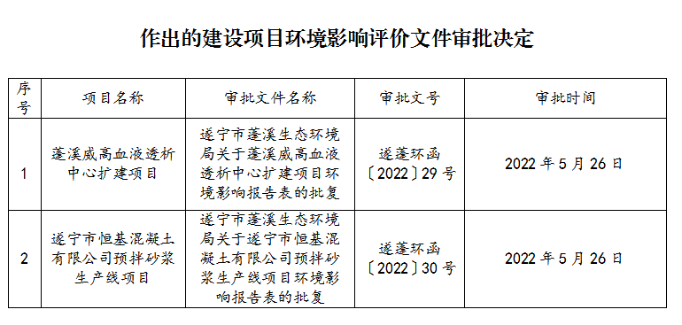 根据建设项目环境影响评价审批程序的有关规定,经审查,2022年5月26日我局共对2个建设项目环境影响评价文件作出审批决定。现将作出的审批决定情况予以公告,公告期为2022年5月30日-2022年6月8日(7个工作日)。