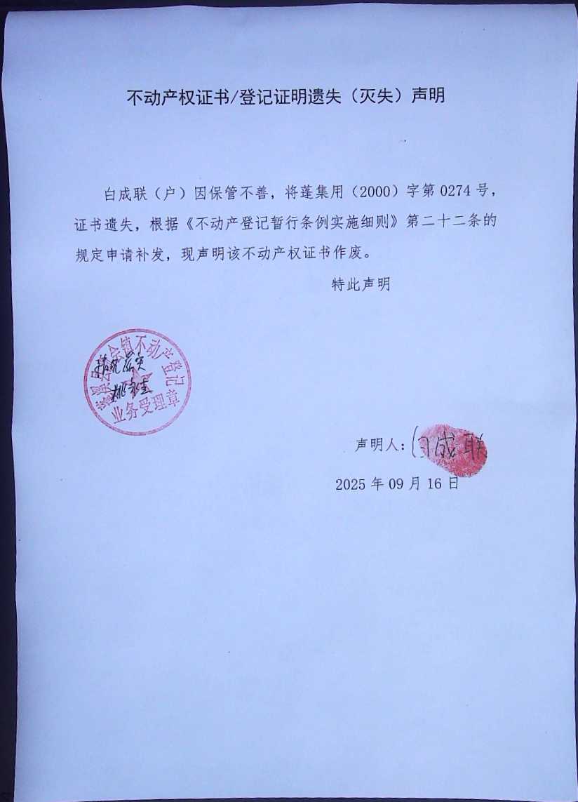 遗失补证公告(新会白成联)