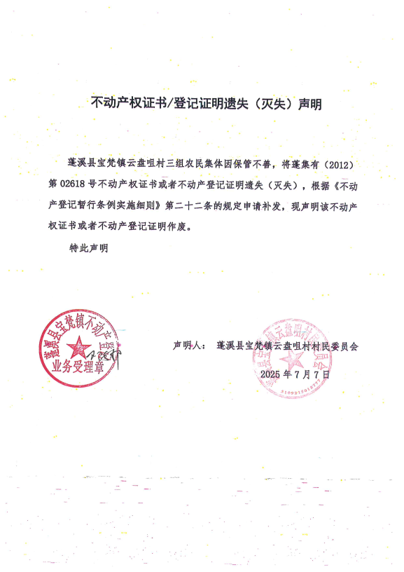遗失补证公告(蓬溪县宝梵镇云盘咀村三组)