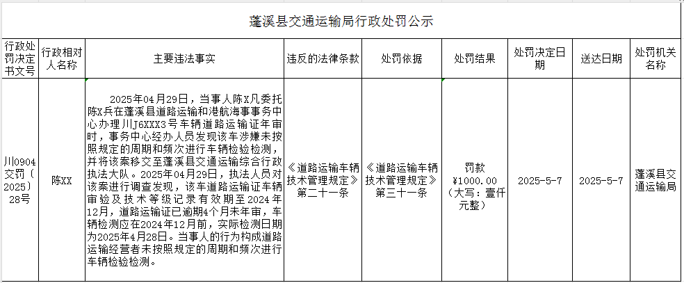 蓬溪县交通运输局行政处罚公示