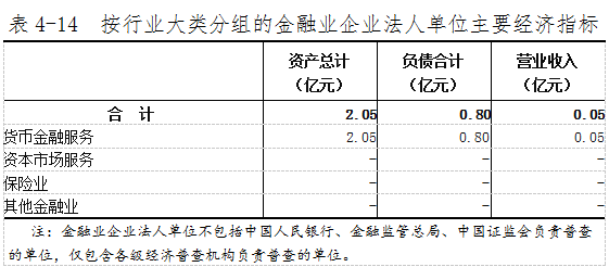 2023年末,金融业企业法人单位资产总计2.05亿元,负债合计0.80亿元。