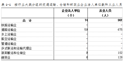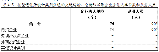 在交通运输、仓储和邮政业企业法人单位从业人员中,内资企业占100%(详见表4-5)。
