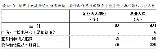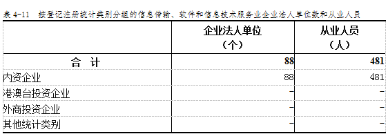 在信息传输、软件和信息技术服务业企业法人单位从业人员中,内资企业占100%(详见表4-11)。