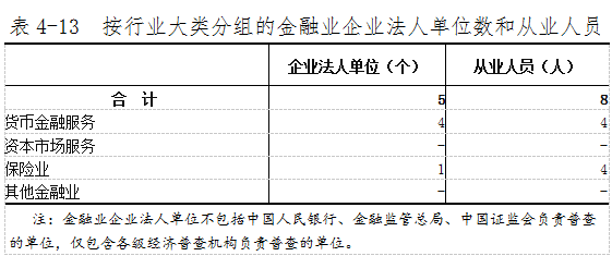 2023年末,全县共有金融业企业法人单位5个,从业人员8人(详见表4-13)。