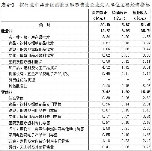 2023年末,批发和零售业企业法人单位资产总计20.10亿元,比2018年末增长82.6%。负债合计5.87亿元。全年实现营业收入51.60亿元(详见表4-3)。