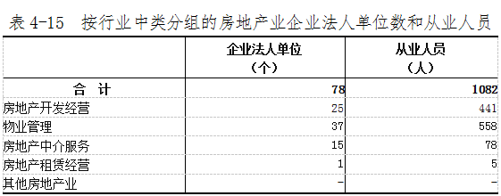 2023年末,全县房地产业企业法人单位从业人员1082人,比2018年末增长25.1%。其中,房地产开发经营企业441人,比2018年末下降33.9%;物业管理企业558人,房地产中介服务企业78人,分别比2018年末增长236.1%和254.5%(详见表4-15)。