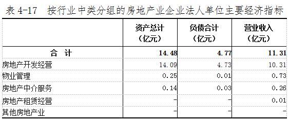 2023年末,房地产业企业法人单位资产总计14.48亿元,比2018年末下降75.6%。其中,房地产开发经营企业14.09亿元,物业管理企业0.25亿元,房地产中介服务企业0.14亿元,分别比2018年末增长-76.2%、525.0%和1300.0%。房地产业企业法人单位负债合计4.77亿元。全年实现营业收入11.31亿元。(详见表4-17)。