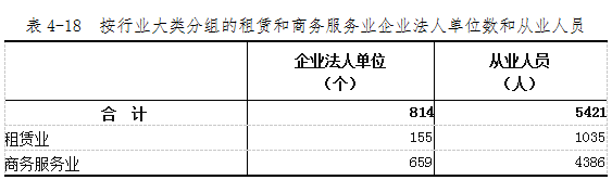 在租赁和商务服务业企业法人单位中,租赁业占19.0%,商务服务业占81.0%。在租赁和商务服务业企业法人单位从业人员中,租赁业占19.1%,商务服务业占80.9%(详见表4-18)。