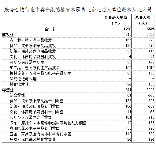 在批发和零售业企业法人单位中,批发业占44.1%,零售业占55.9%。在批发和零售业企业法人单位从业人员中,批发业占49.5%,零售业占50.5%(详见表4-1)。
