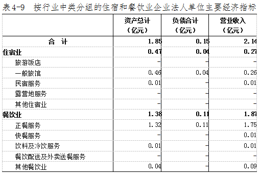 2023年末,住宿和餐饮业企业法人单位资产总计1.85亿元,比2018年末增长-56.9%。负债合计0.15亿元。全年实现营业收入2.14亿元(详见表4-9)。