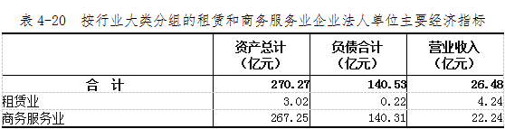 2023年末,租赁和商务服务业企业法人单位资产总计270.27亿元,比2018年末增长1680.4%。其中,租赁业企业法人单位资产总计3.02亿元,商务服务业企业法人单位资产总计267.25亿元,分别比2018年末增长243.2%和1770.2%。租赁和商务服务业企业法人单位负债合计140.53亿元。全年实现营业收入26.48亿元(详见表4-20)。