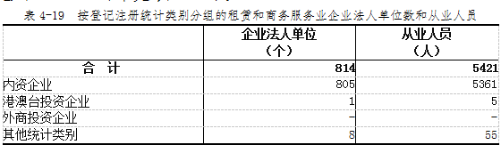 在租赁和商务服务业企业法人单位从业人员中,内资企业占98.9%(详见表4-19)。