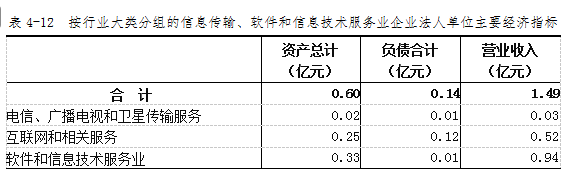 2023年末,信息传输、软件和信息技术服务业企业法人单位资产总计0.60亿元,比2018年末增长4515.4%。负债合计0.14亿元。全年实现营业收入1.49亿元(详见表4-12)。