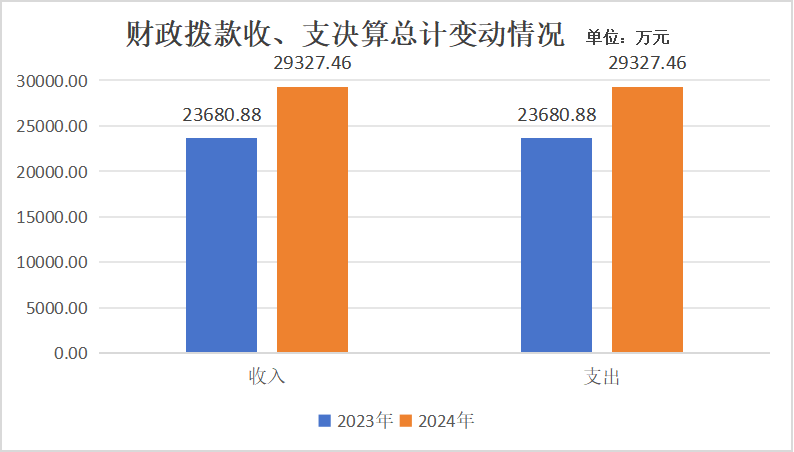 2024年度财政拨款收、支总计均为29327.46万元。与2023年度相比,财政拨款收、支总计各增加5646.58万元,增长23.84%。主要变动原因是本年度三所运行经费、污水处理等项目收入和支出较上年增加。
