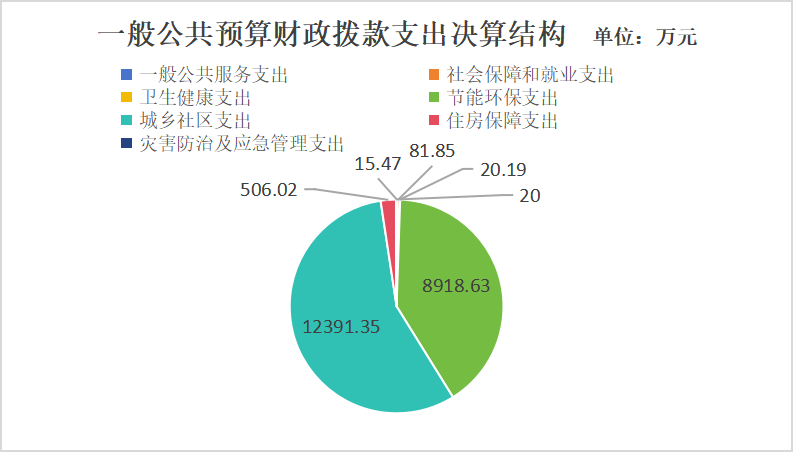 2024年度一般公共预算财政拨款支出21953.51万元,主要用于以下方面:一般公共服务支出15.47万元,占0.07%;社会保障和就业支出81.85万元,占0.37%;卫生健康支出20.19万元,占0.09%;节能环保支出8918.63万元,占40.63%;城乡社区支出12391.35万元,占56.44%;住房保障支出506.03万元,占2.31%;灾害防治及应急管理支出20.00万元,占0.09%。