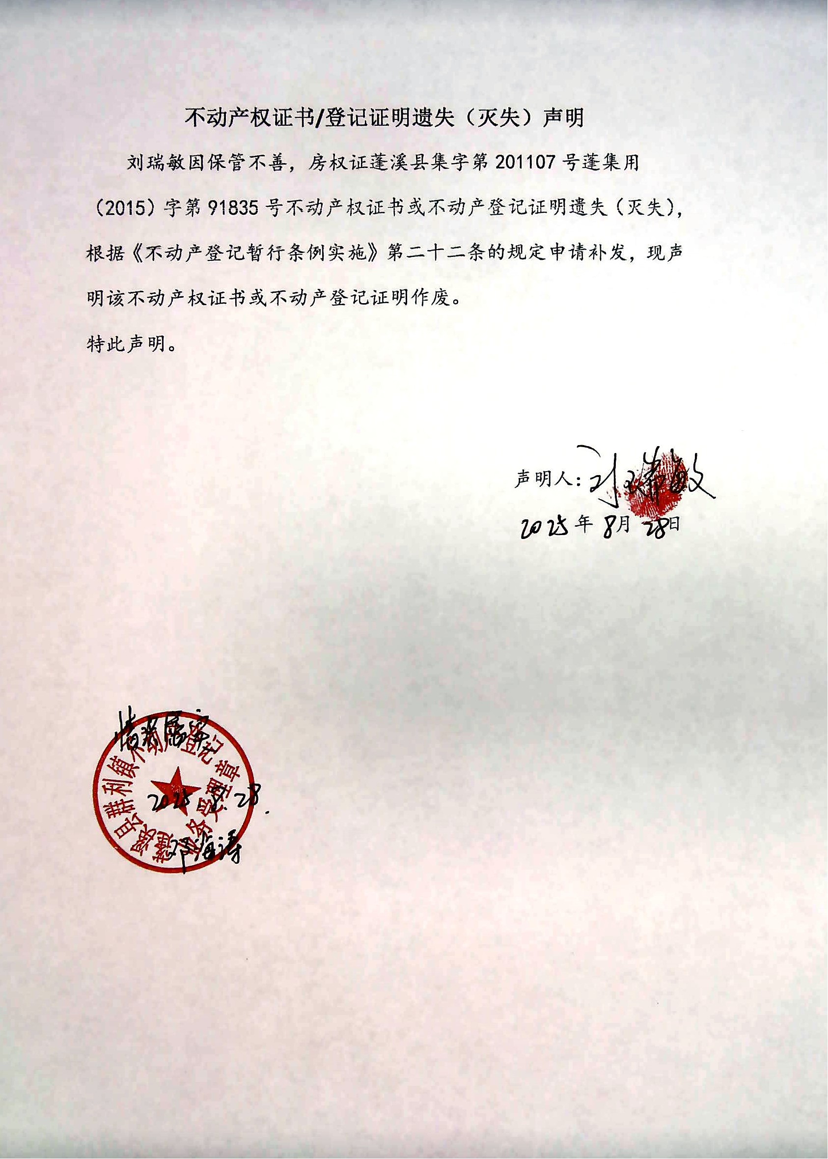 遗失补证公告(刘瑞敏)
