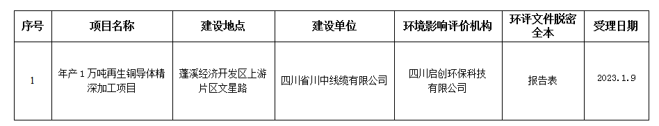 根据建设项目环境影响评价审批程序的有关规定,2023年1月9日我局受理1个建设项目环境影响评价文件。现将受理情况予以公告。如有建议意见,请于2023年1月13日(五个工作日)前向我局提出。