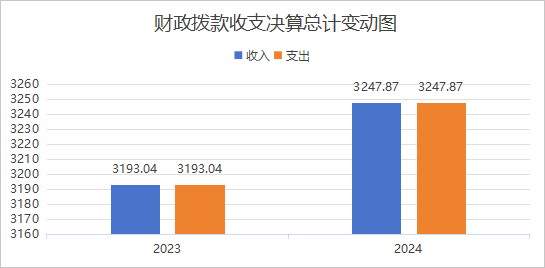 2024年度收、支总计均为3,247.87万元。与2023年度相比,收、支总计各增加54.83万元,增长1.71%。主要变动原因是一般行政管理事务、中小企业发展专项支出增加。