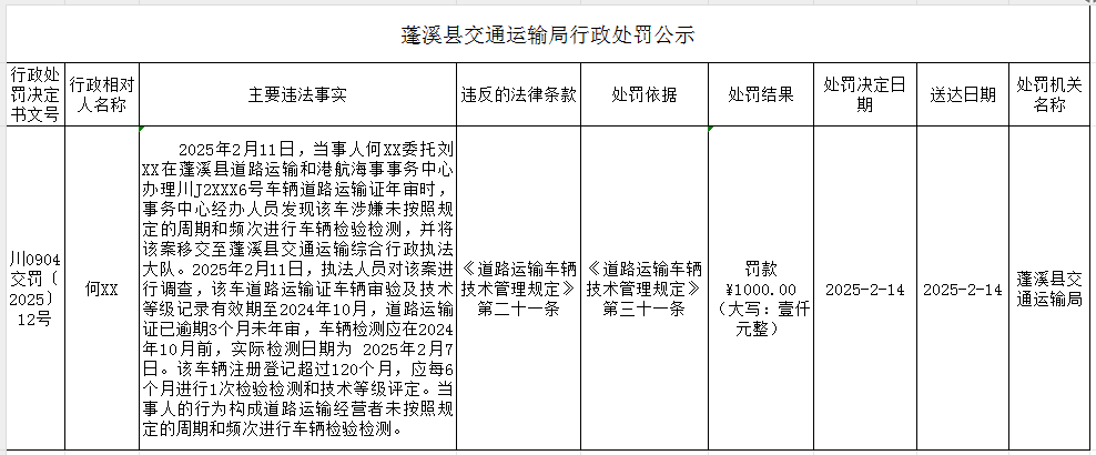 蓬溪县交通运输局行政处罚公示