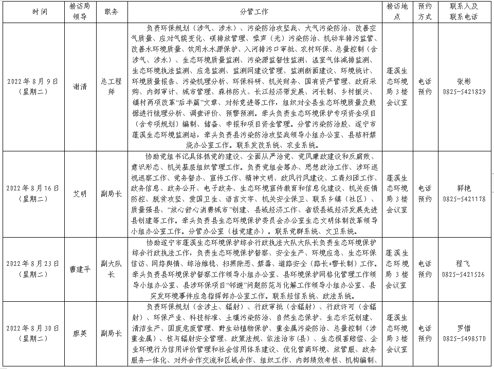 为深入贯彻习近平生态文明思想和习近平总书记关于加强和改进人民信访工作的重要论述,切实增强宗旨意识,不断提升人民群众满意度和获得感,经研究,决定开展“服务群众办实事 遂宁市蓬溪生态环境局局长接待日”活动,现将2022年8月接访安排公告如下。