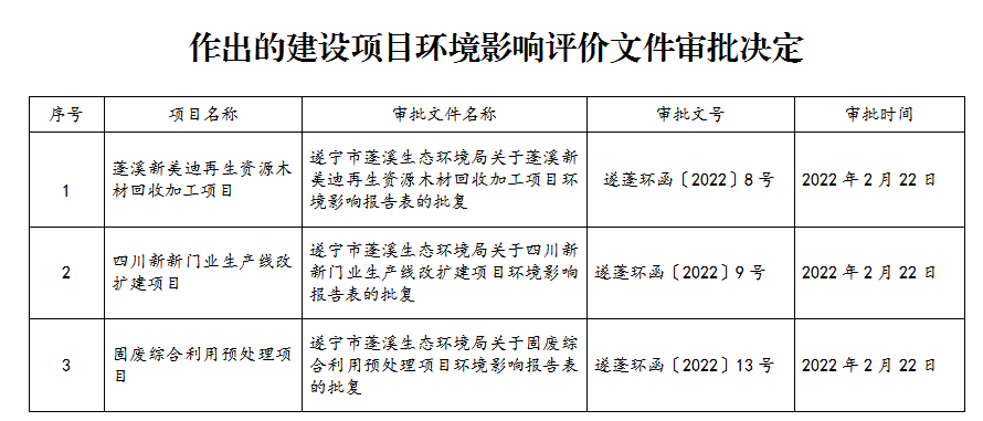 根据建设项目环境影响评价审批程序的有关规定,经审查,2022年2月22日我局共对3个建设项目环境影响评价文件作出审批决定。现将作出的审批决定情况予以公告,公告期为2022年2月23日-2022年3月3日(7个工作日)。