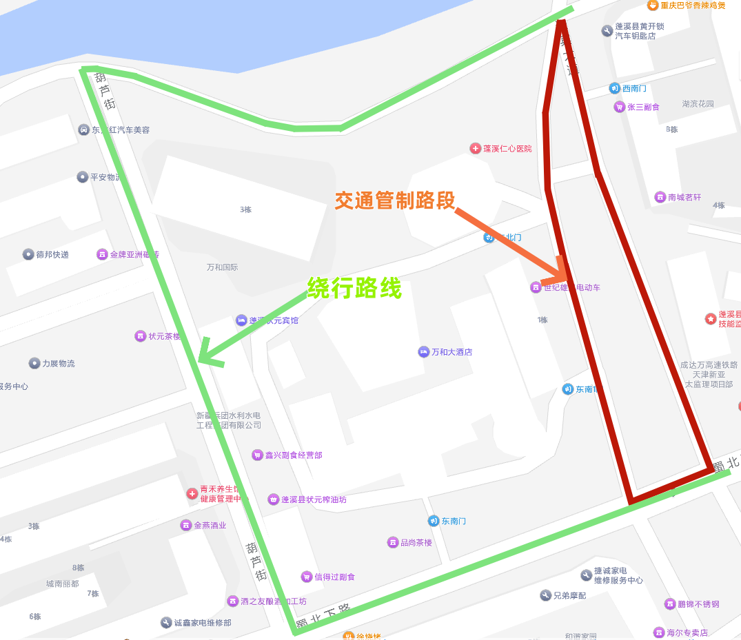 二、参考绕行方案:万和酒店→蜀北下路→葫芦街→香溪东路→仁心医院绕行。