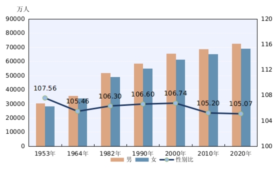 全国人口[2]中,男性人口为723339956人,占51.24%;女性人口为688438768人,占48.76%。总人口性别比(以女性为100,男性对女性的比例)为105.07,与2010年第六次全国人口普查基本持平。