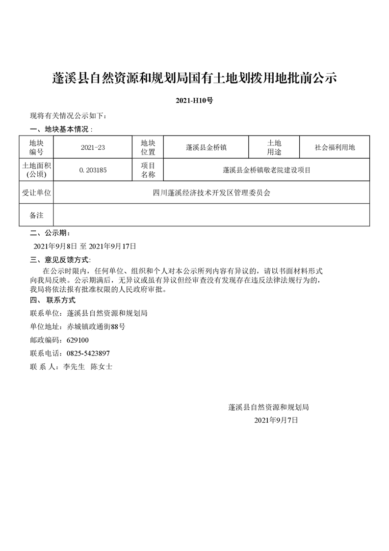 蓬溪县自然资源和规划局国有土地划拨用地批前公示(2021-H10号)