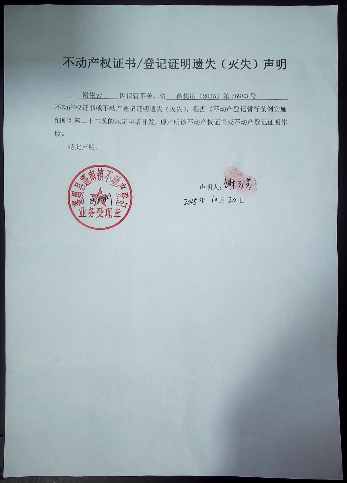 遗失补证公告(谢生云)