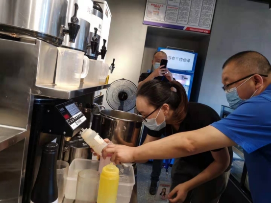 近期,网络曝光了某些品牌奶茶店存在食品安全问题,蓬溪县市场监管局迅速反应,立即组织对辖区内奶茶店开展突击检查。8月4日,县市场监管局首先对网络曝光连锁品牌奶茶店进行检查,重点对其证照情况、工作人员健康证、操作环境卫生、操作流程、原料保存使用及疫情防控等方面开展检查。
