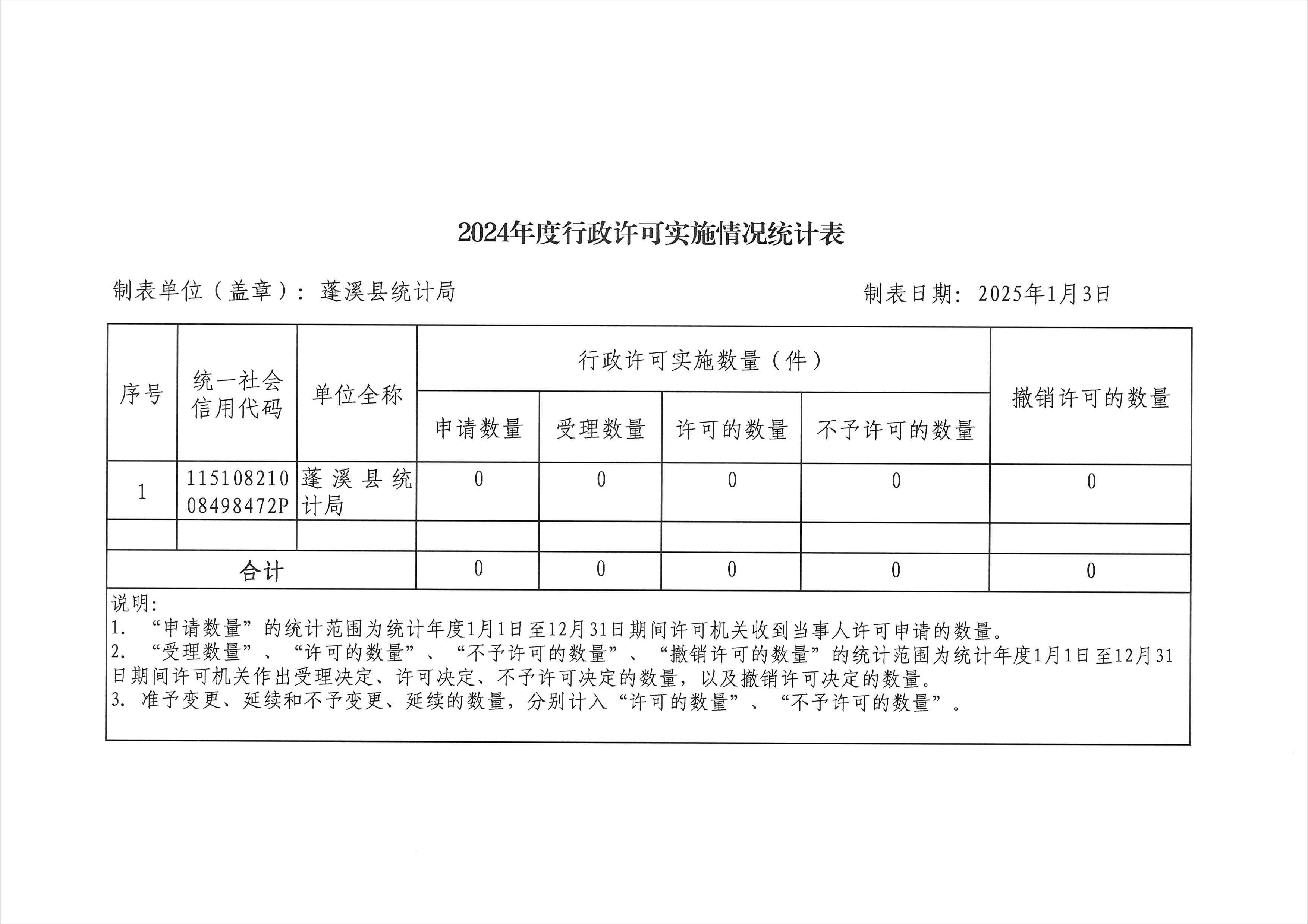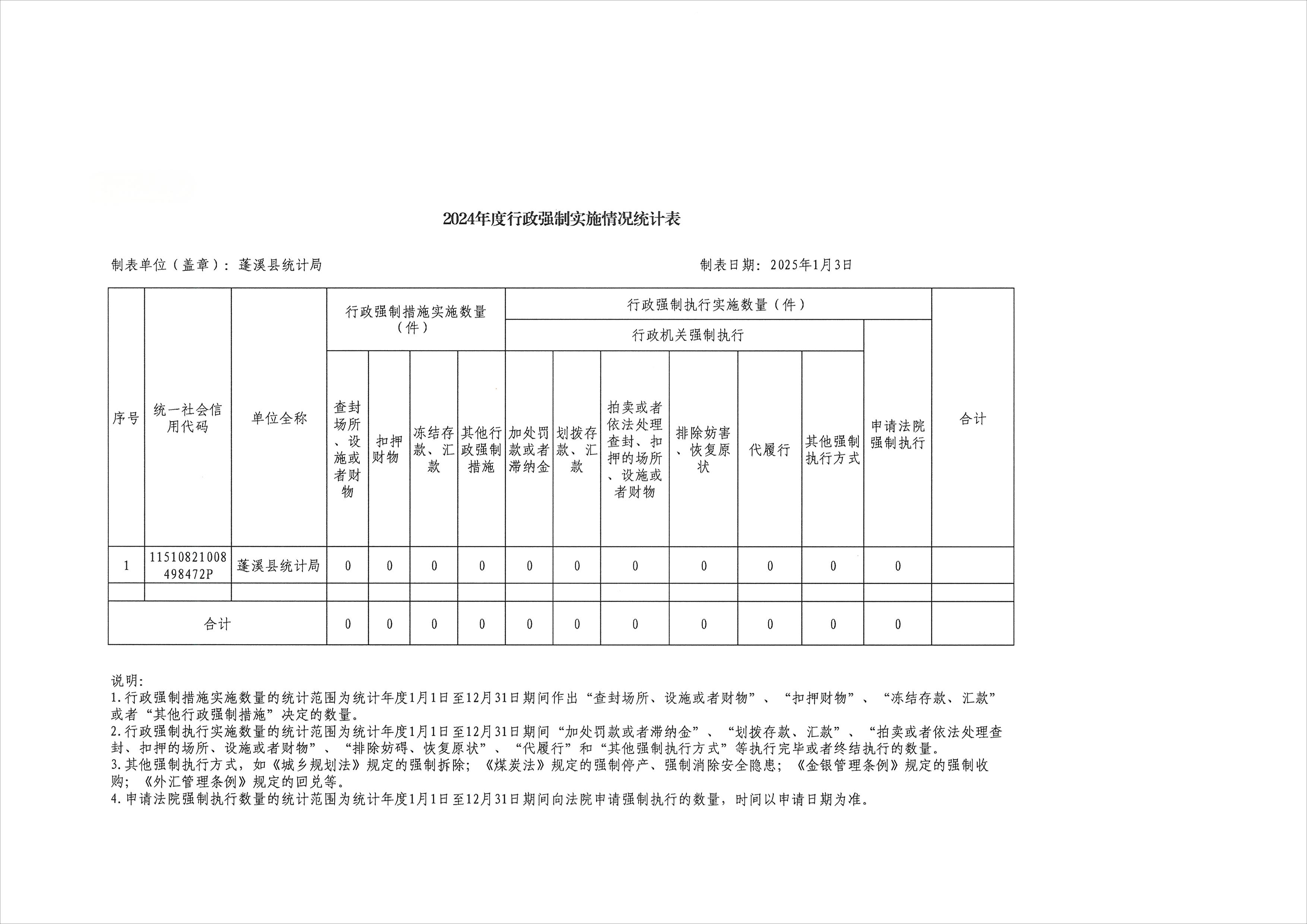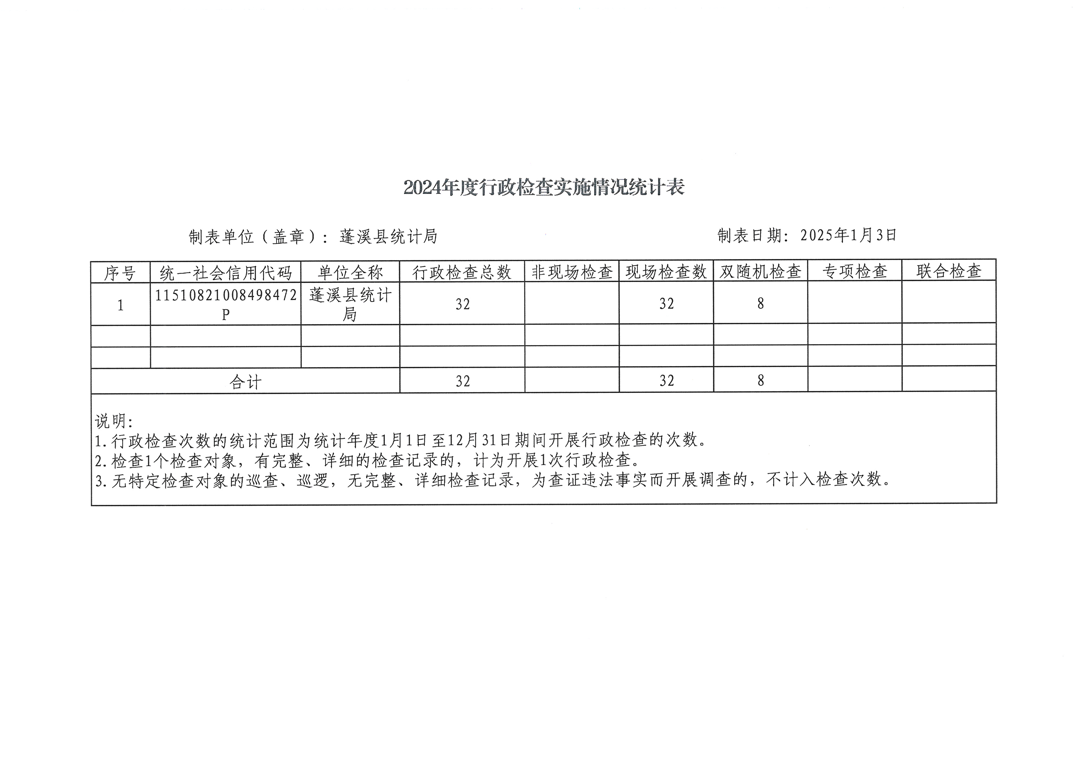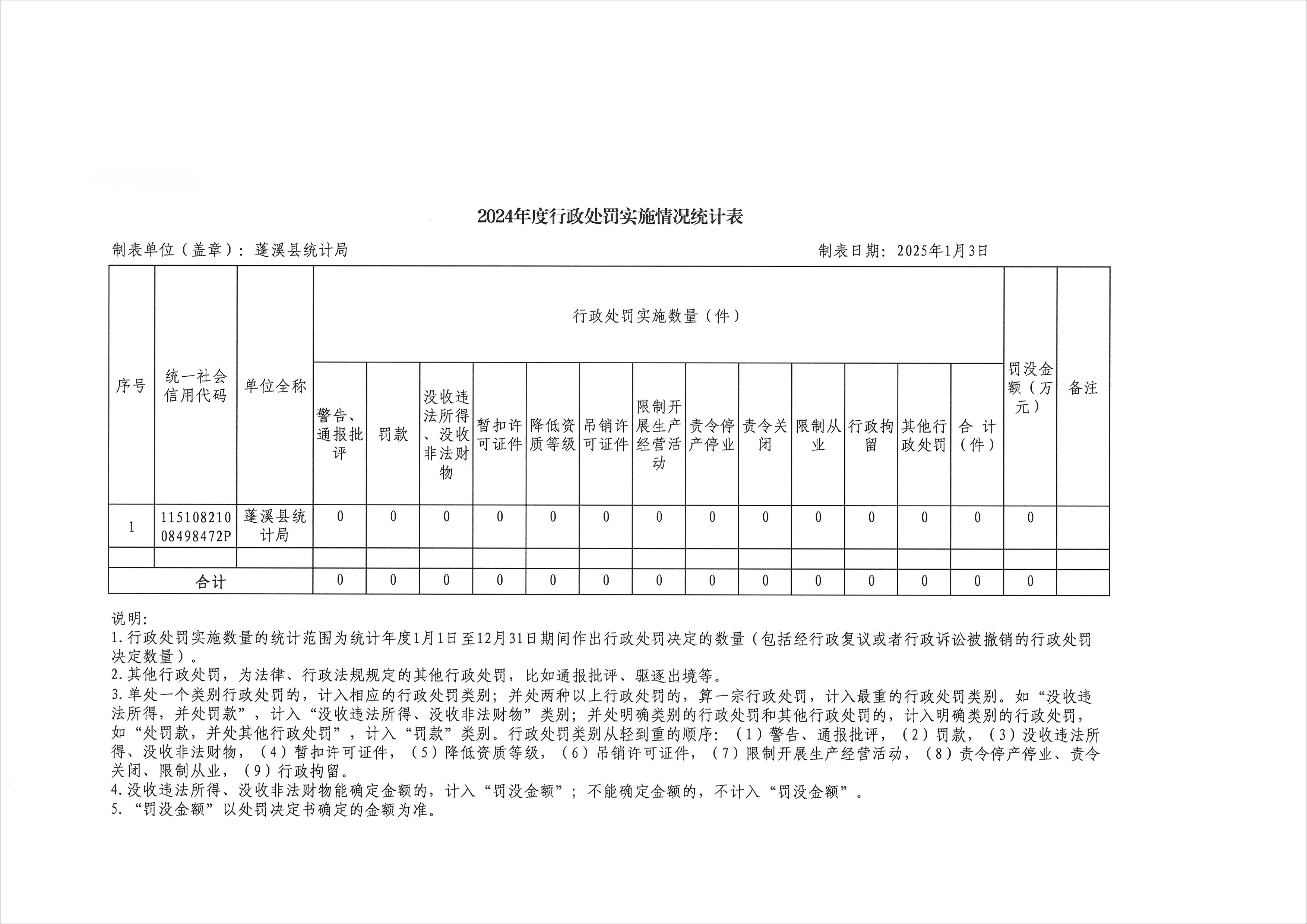 蓬溪县统计局2024年度行政许可、行政处罚、行政强制、行政检查实施情况统计公示表