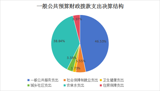 2024年度一般公共预算财政拨款支出1146.01万元,主要用于以下方面:一般公共服务支出533.23万元,占46.53%;社会保障和就业支出63.55万元,占5.55%;卫生健康支出19.8万元,占1.73%;城乡社区支出38.78万元,占3.38%;农林水支出445.14万元,占38.84%;住房保障支出45.5万元,占3.97%。