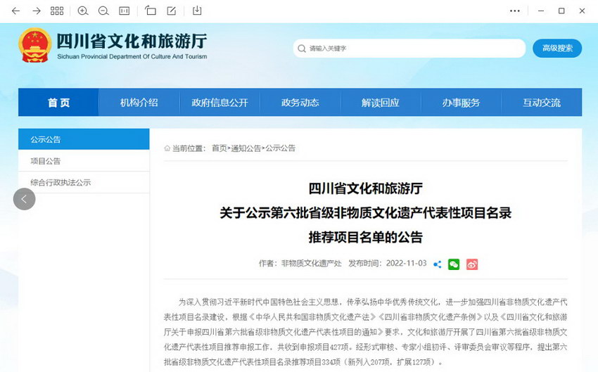 近日,四川省文化和旅游厅向社会公示“第六批省级非物质文化遗产代表性项目名录推荐项目名单”,公示期20日(2022年11月3日至2022年11月22日)。