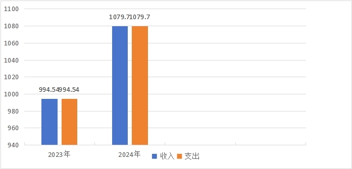2024年度收入总计1079.70万元、支出总计1079.70万元。与2023年相比,收入增加85.16万元,增加8.56%;支出总计增加85.16万元,增加8.56%。主要变动原因是:2024年其他收入减少1.44万元,工会经费增加0.06万元,项目支出增加22.40万元和人员经费增加64.14万元。