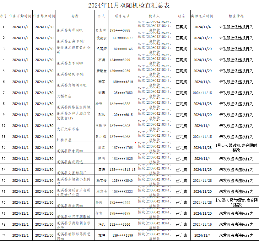 蓬溪县文化市场综合行政执法大队2024年11月双随机检查汇总表