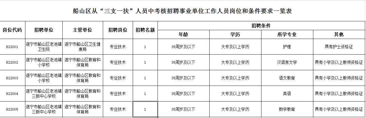 1.船山区从“三支一扶”人员中考核招聘事业单位工作人员岗位条件一览表
