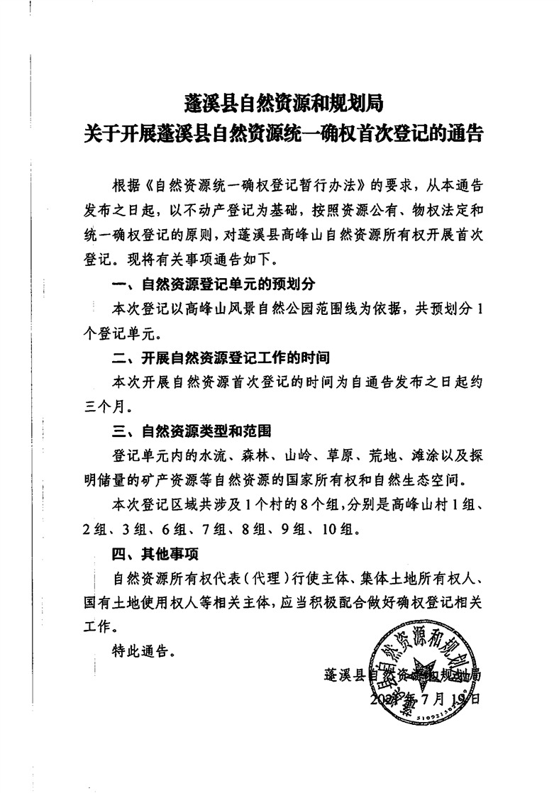 蓬溪县自然资源和规划局关于开展蓬溪县自然资源统一确权首次登记的通告