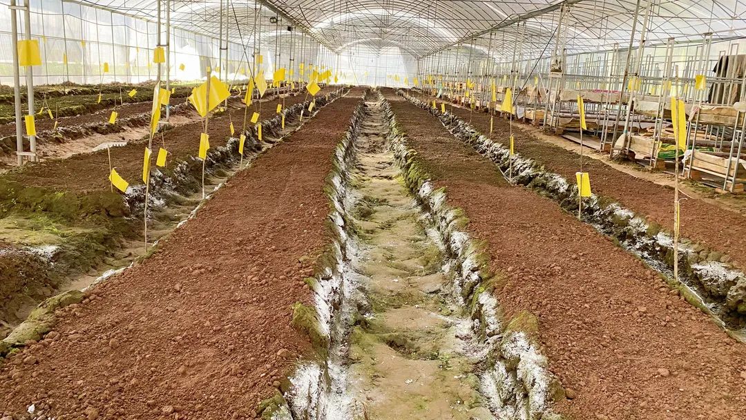 在白庙村的菌菇基地大棚里,去年10月种下的1.3万袋黑皮鸡枞菌菌种,经过一个冬天的培育,在春天里长成了拇指般大小的菌菇。黑皮鸡枞菌呈黑褐色,和泥土的颜色相似。