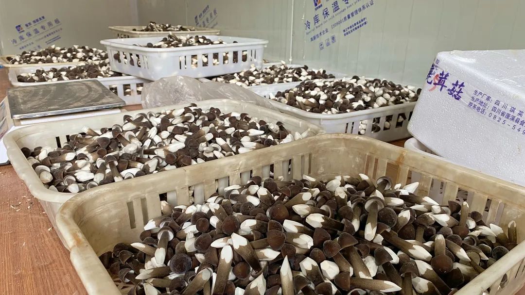黑皮鸡枞菌采收后就进入冷冻库冷藏。经过削菇、打包,黑皮鸡枞菌就可以销售了。今年,菌菇基地已有1000多斤黑皮鸡枞菌端上了餐桌。除了借助琪英菌业搭建的产品收购包销物流平台进行销售外,白庙村菌菇基地正积极拓展销售渠道,与周边市县的大型酒店建立合作,以解决菌菇销售之忧。