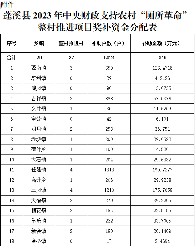 附件:蓬溪县2023年中央财政支持农村“厕所革命”整村推进项目奖补资金分配表