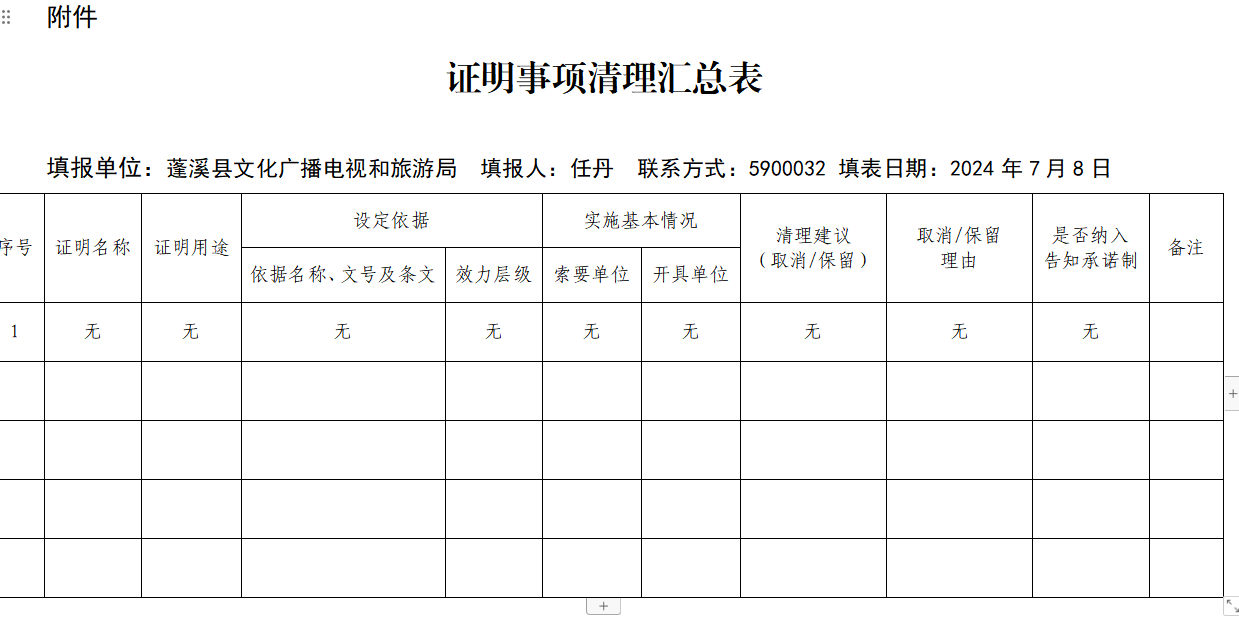 蓬溪县文化广播电视和旅游局证明事项清理汇总表