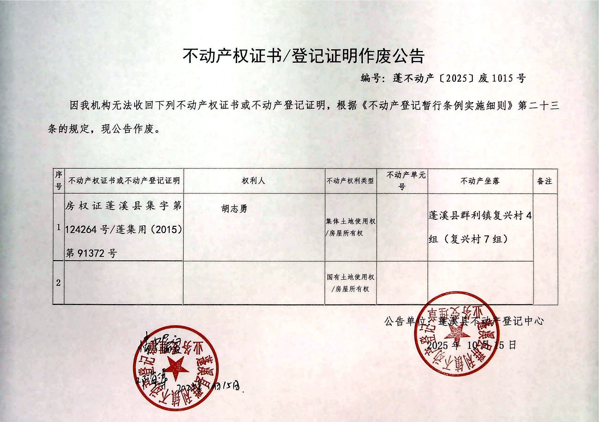 作废登记公告(胡志勇)