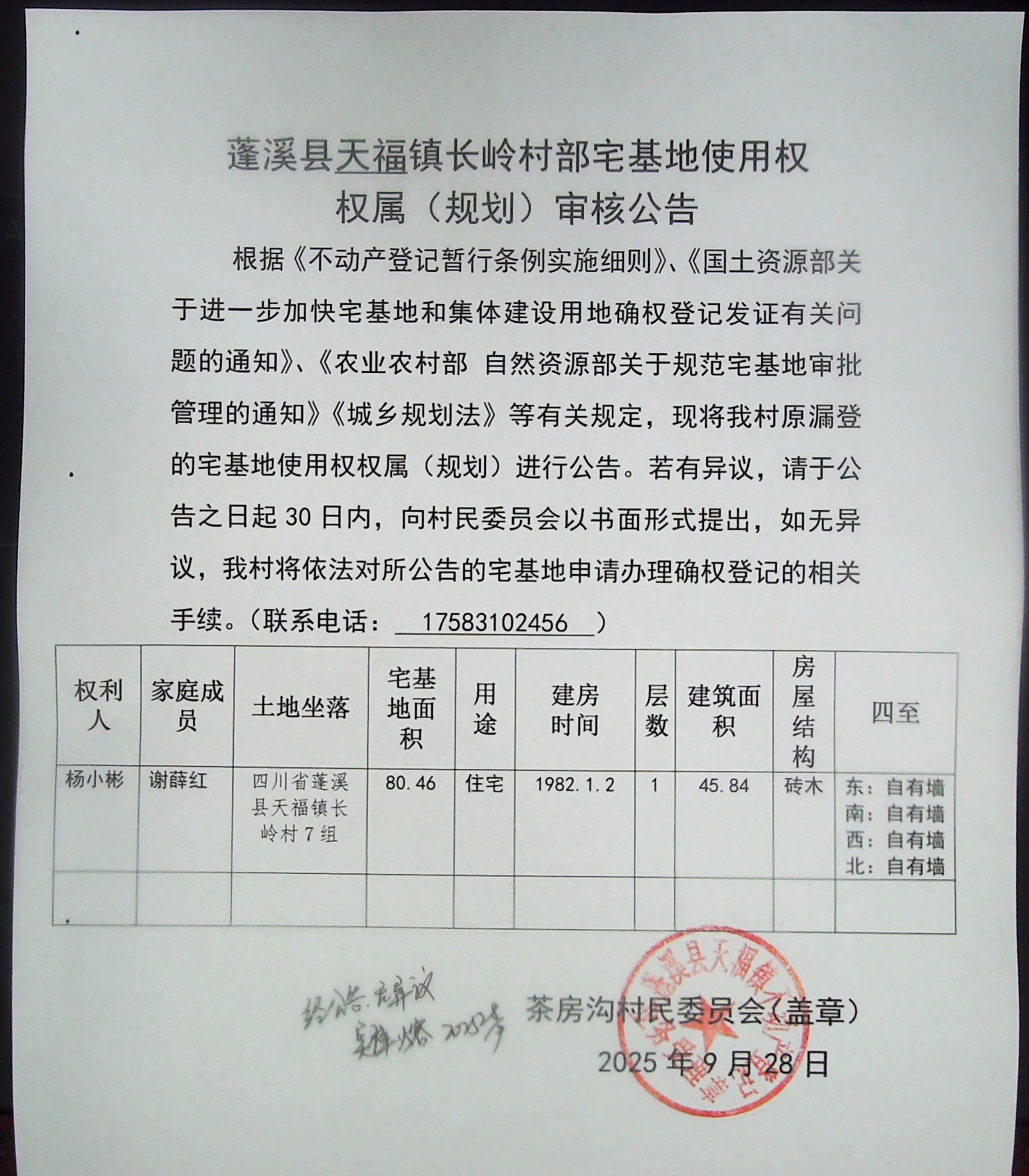 首次登记公告(杨小彬)