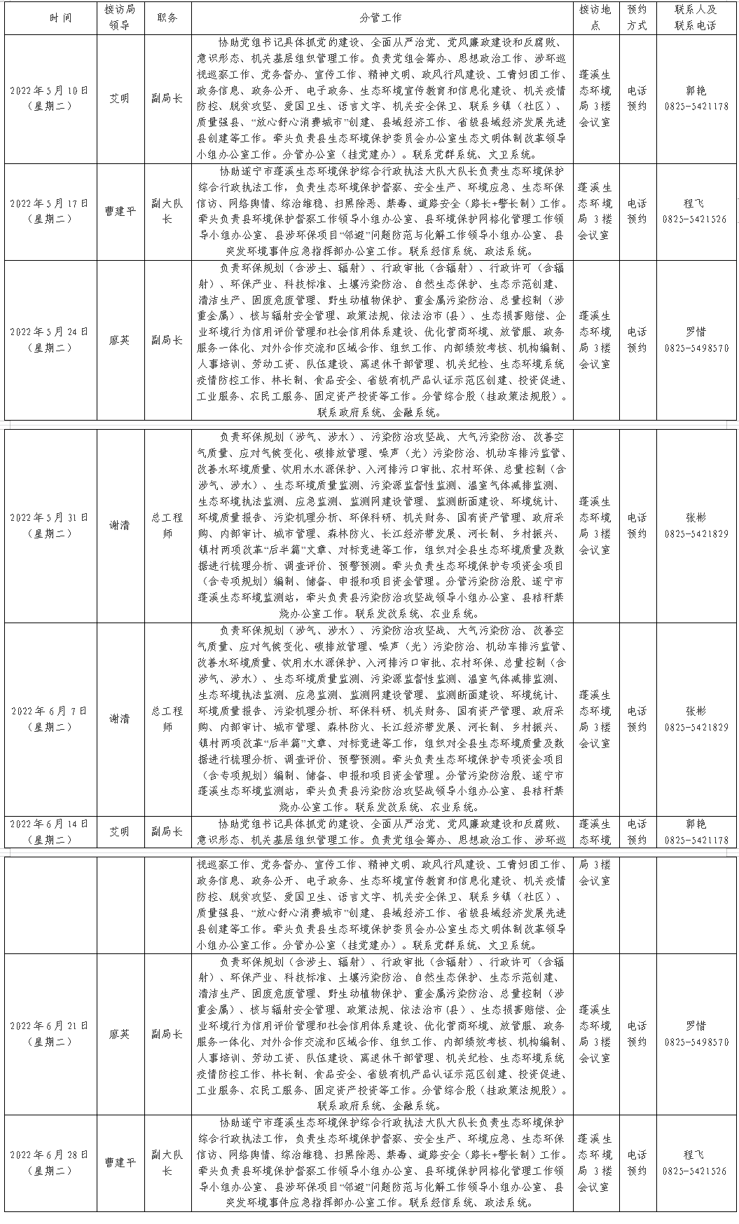 为深入贯彻习近平生态文明思想和习近平总书记关于加强和改进人民信访工作的重要论述,切实增强宗旨意识,不断提升人民群众满意度和获得感,经研究,决定开展“服务群众办实事 遂宁市蓬溪生态环境局局长接待日”活动,现将2022年5月和6月接访安排公告如下。