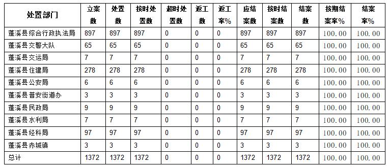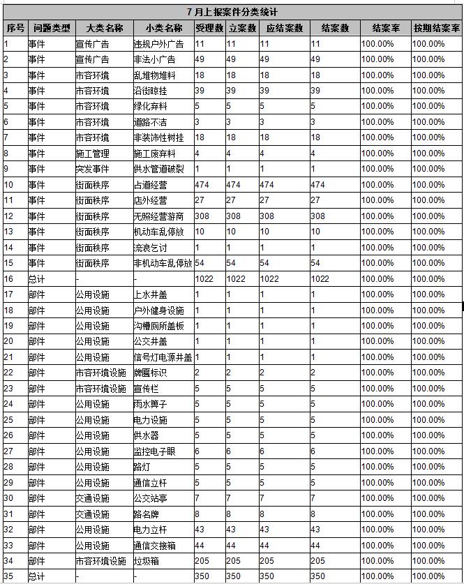 蓬溪县数字城管2022年7月共上报2368件。其中信息采集上报1385件,自行处置上报983件。立案1372件,应结案1372件,结案1372件,结案率100%,按期结案1372件,按期结案率100%。事件类立案1022件,部件类立案350件,立案5件以上的案件种类23种。