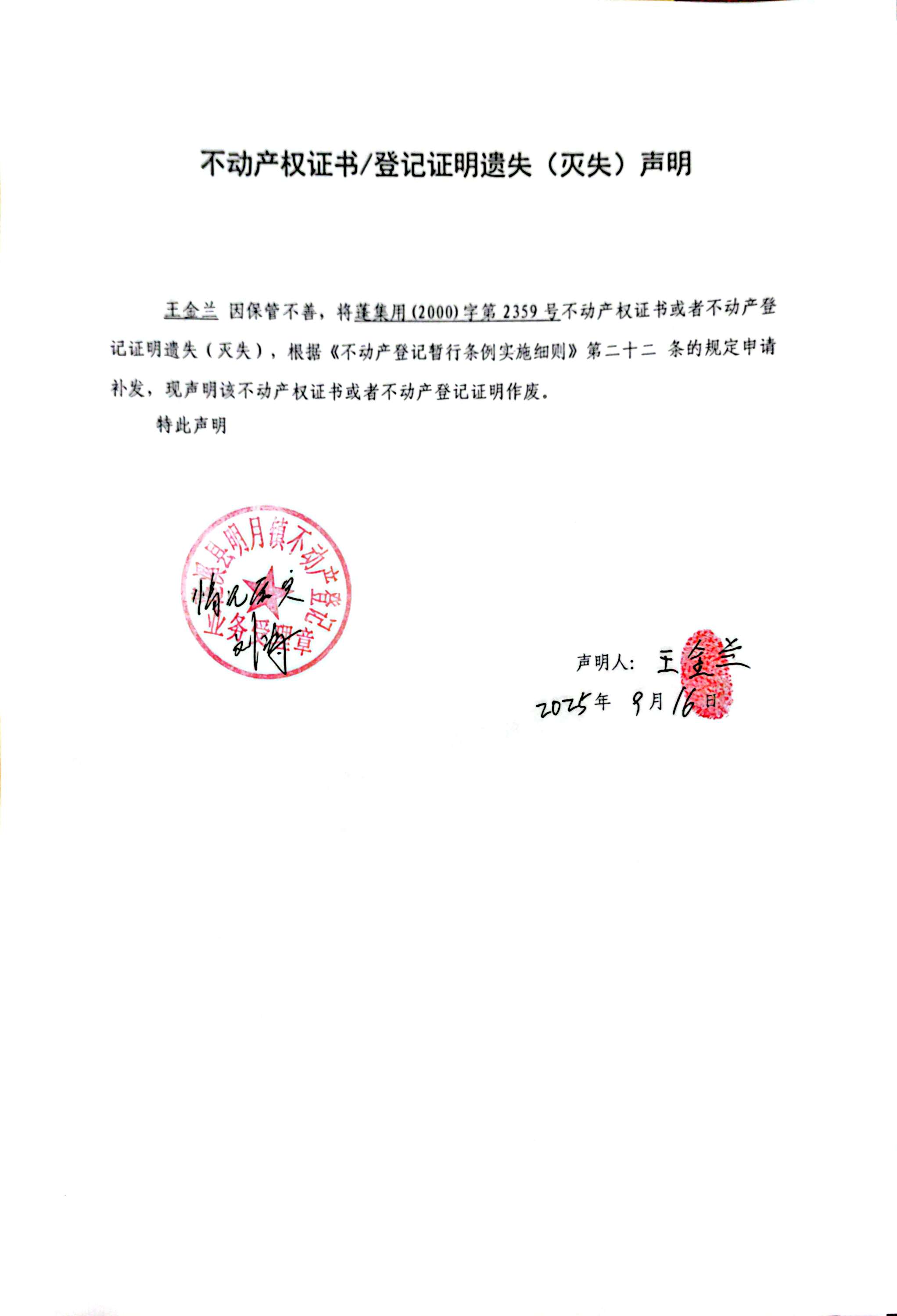 遗失补证公告(王金兰)