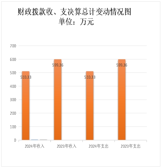 2024年度财政拨款收、支总计均为510.33万元。与2023年度相比,财政拨款收、支总计各减少89.03万元,下降14.86%。主要变动原因是1、生均办公费减少;2、减少了课后服务费用。