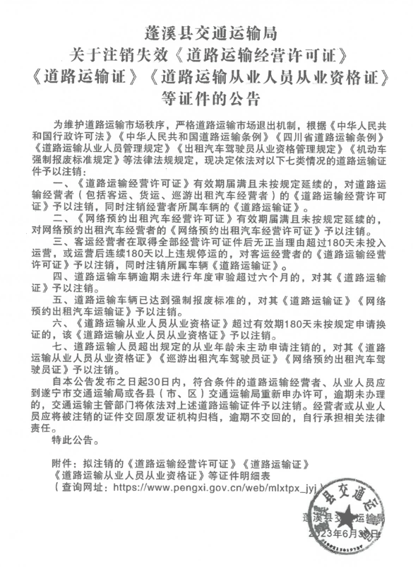 蓬溪县交通运输局关于注销失效《道路运输经营许可证》《道路运输证》《道路运输从业人员从业资格证》 等证件的公告
